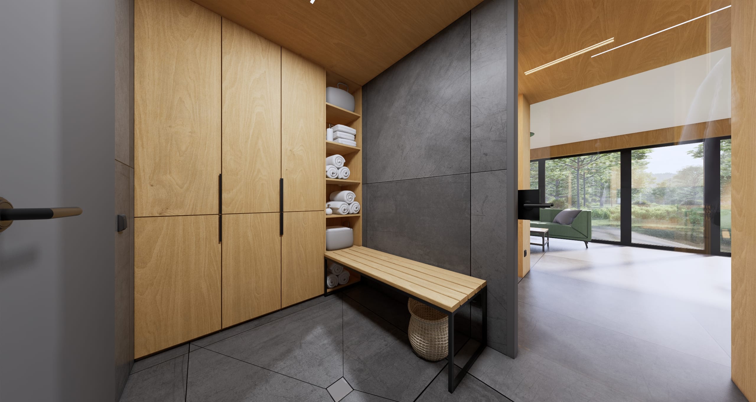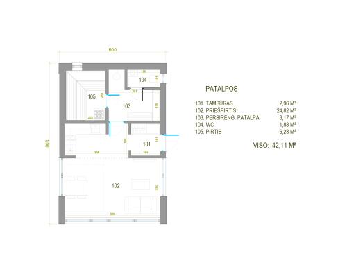 Modernus, kompaktiškas I gr. nesudėtingas statinys – karkasinė pirtis, vieno aukšto, 42m2 bendro ploto su daugiašlaičiu stogu. Numatytas funkcionalus išplanavimas: tambūras, priešpirtis, persirengimo patalpa su dušu, sanitarinis mazgas ir pirties patalpa.