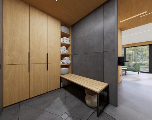 Modernus, kompaktiškas I gr. nesudėtingas statinys – karkasinė pirtis, vieno aukšto, 42m2 bendro ploto su dvišlaičiu stogu. Numatytas funkcionalus išplanavimas: tambūras, priešpirtis, persirengimo patalpa su dušu, sanitarinis mazgas ir pirties patalpa.
