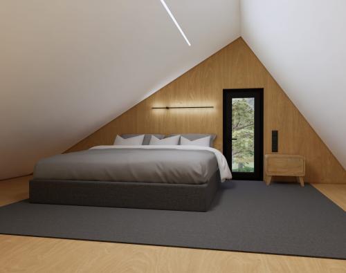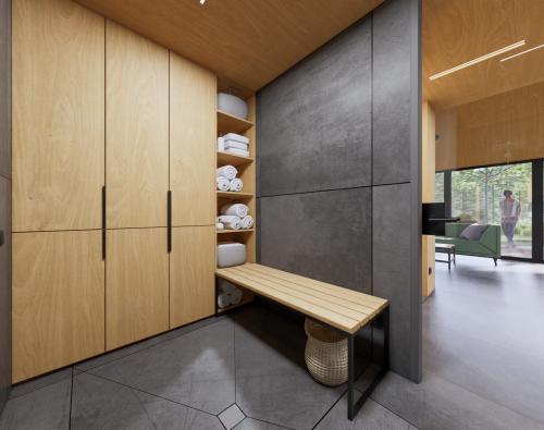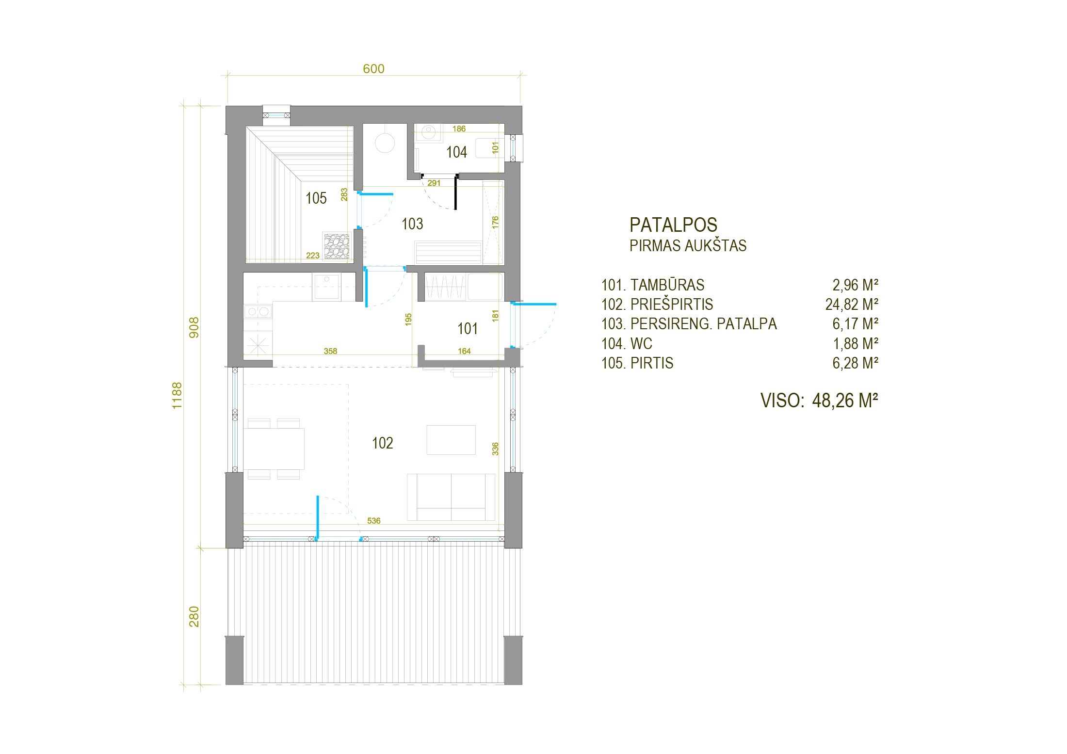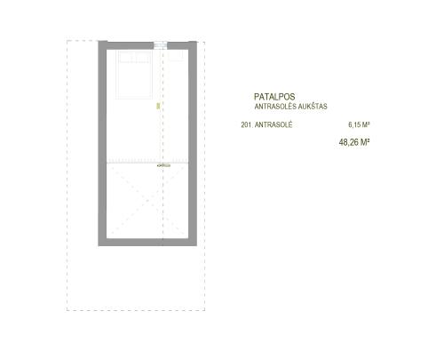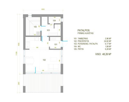 Modernus, kompaktiškas I gr. nesudėtingas statinys – karkasinė pirtis, vieno aukšto su antrasole, 48m2 bendro ploto su dvišlaičiu stogu. Numatytas funkcionalus išplanavimas: tambūras, priešpirtis, persirengimo patalpa su dušu, sanitarinis mazgas, pirties patalpa ir antrasolė. Prie pastato numatyta terasa su stogine, į kurią patenkama iš priešpirčio.