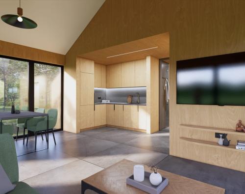Modernus, kompaktiškas I gr. nesudėtingas statinys – karkasinė pirtis, vieno aukšto, 42m2 bendro ploto su dvišlaičiu stogu. Numatytas funkcionalus išplanavimas: tambūras, priešpirtis, persirengimo patalpa su dušu, sanitarinis mazgas ir pirties patalpa. Prie pastato numatyta terasa su stogine, į kurią patenkama iš priešpirčio.