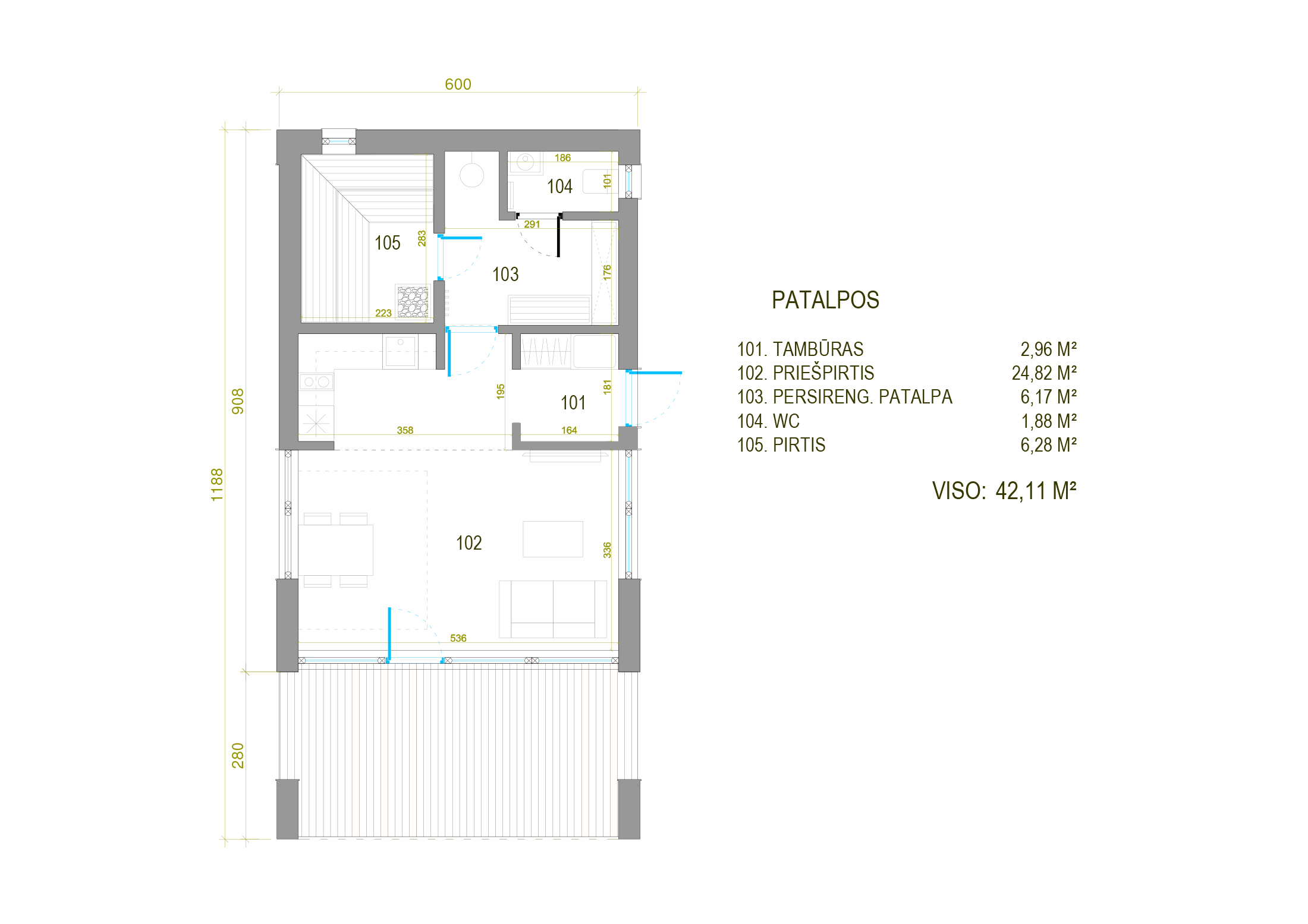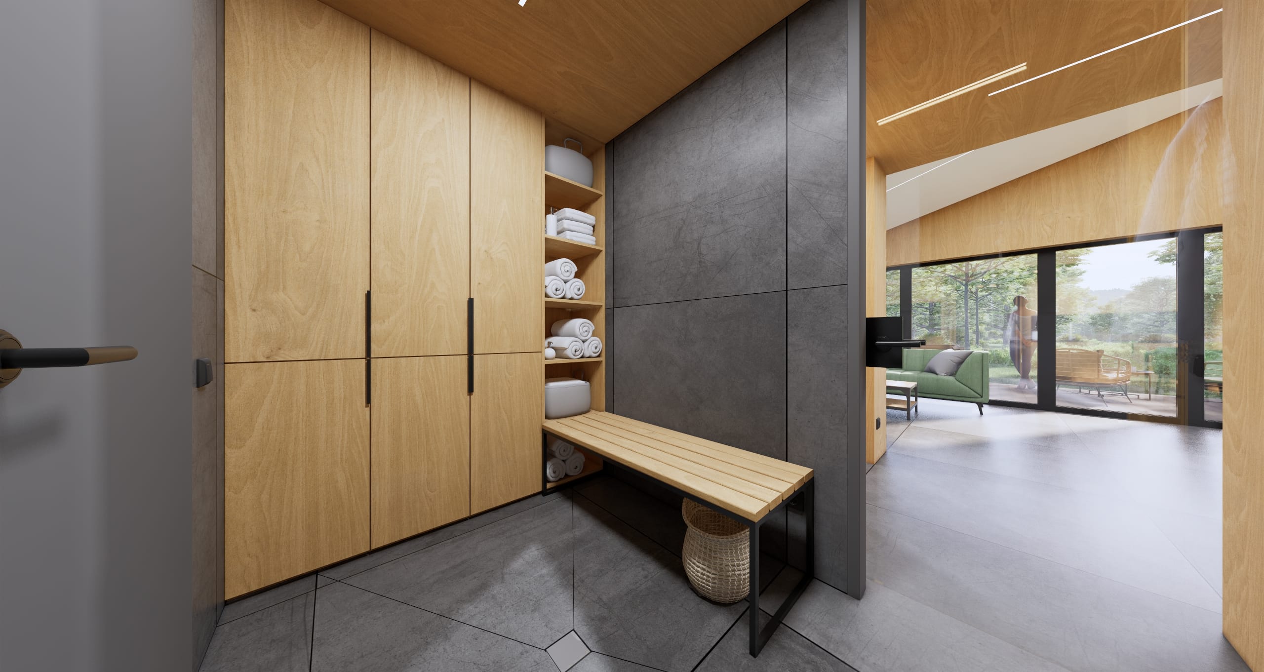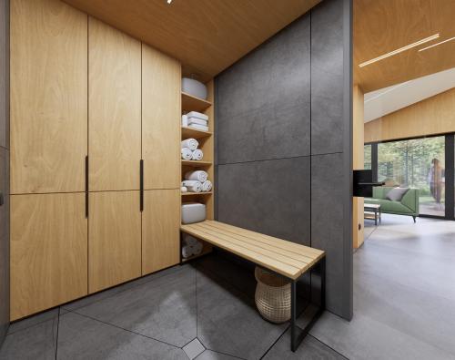 Modernus, kompaktiškas I gr. nesudėtingas statinys – karkasinė pirtis, vieno aukšto, 42m2 bendro ploto su vienšlaičiu stogu. Numatytas funkcionalus išplanavimas: tambūras, priešpirtis, persirengimo patalpa su dušu, sanitarinis mazgas ir pirties patalpa. Prie pastato numatyta terasa su stogine, į kurią patenkama iš priešpirčio.
